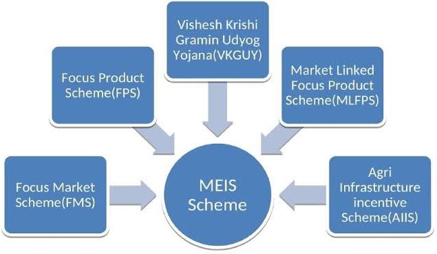 There were five schemes – Focus Market Scheme, Focus Product Scheme, Vishesh Krishi Gramin Udyog Yojana, Market Linked Focus Product Scheme, Agri Infrastructure incentive scheme under Foreign Trade Policy (FTP) 2009-14 which was replaced by MEIS Scheme. All the above five Schemes merged into a single MEIS Scheme, which removes various kinds of restrictions and significantly enlarges the scope of export incentive schemes present in earlier FTP.